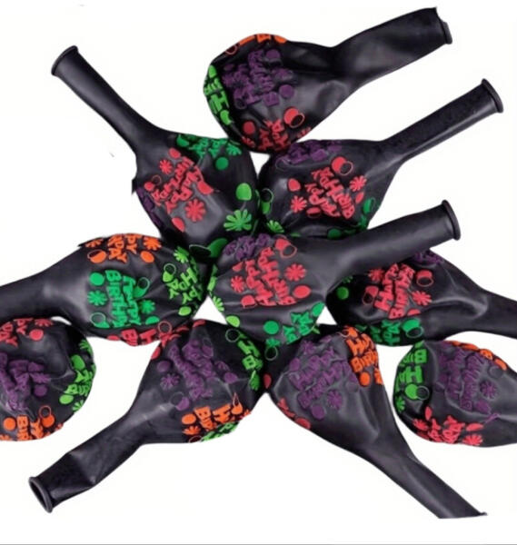 10 db fekete léggömb, fluoreszkáló Happy Birthday színes felirattal