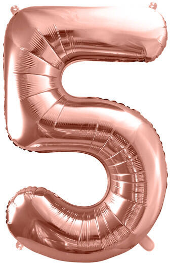 Fém fólia lufi ''5'' szám, rózsaszín arany, felfújás előtti méret kb. 100 cm (39''), méret felfújás után kb. 86 cm (34"). Fújja fel héliummal és levegővel.