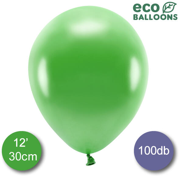 Zöld lufi, metál színben, levegővel vagy gázzal való feltöltésre alkalmas átmérő: 32 cm. 100 db/csomag.