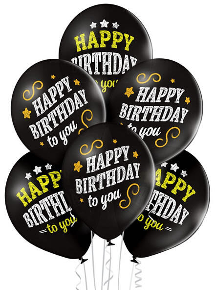 Fekete lufi, Happy Birthday to you felírattal. Átmérő: 30 cm.