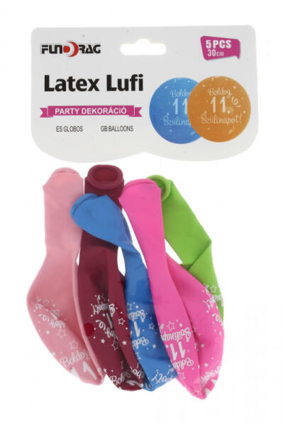 Fundrag  "boldog 11. szülinapot!" mintás latex lufi csomag. 5 darab/csomag.  Felfújva az átmérője 30 cm.  Egyes színmennyiség csomagolásonként eltérő lehet! Héliummal illetve levegővel is tölthető!  Az ár csomagra értendő!
