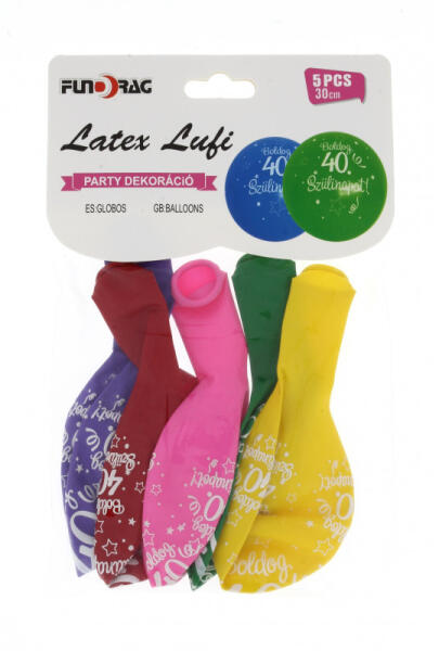 Fundrag  "boldog 40. szülinapot!" mintás latex lufi csomag. 5 darab/csomag.  Felfújva az átmérője 30 cm.  Egyes színmennyiség csomagolásonként eltérő lehet! Héliummal illetve levegővel is tölthető!  Az ár csomagra értendő!