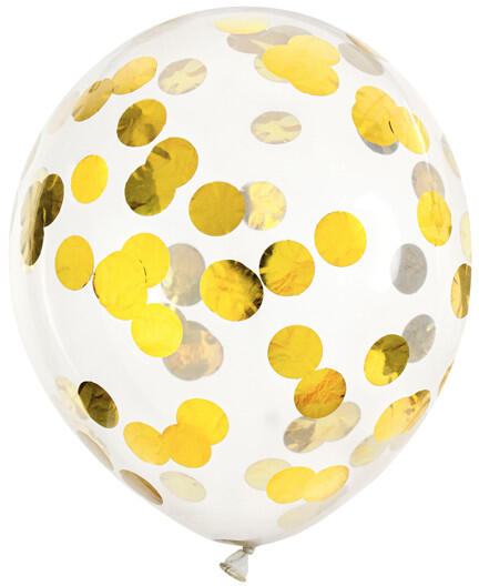 Átlátszó lufi arany fémes konfettivel, belül kör alakú, a léggömb átmérője kb. 30 cm. (1 db / 6 db. )