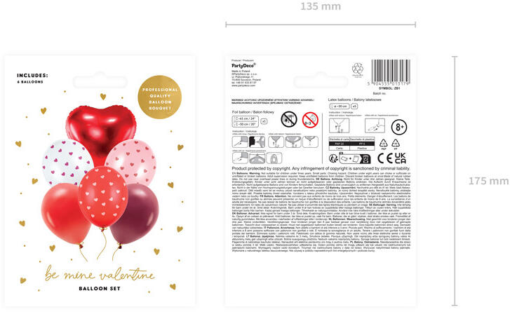 Léggömb szett Be mine Valentine, a készlet 6 db lufit tartalmaz (Erős léggömbök: 1 db pasztell Pure White színben, rózsaszín nyomattal, 1 db Pastel Baby Pink színben piros nyomattal, 1 db Piros színben rózsaszín nyomattal, 1 db fólia lufi fémvörös színben). Erős léggömbök átmérője kb. 30 cm, fólia lufi mérete felfújás után kb. 50 cm (20''). A készlet egy szívószálat tartalmaz. (1 db / 6 db. )