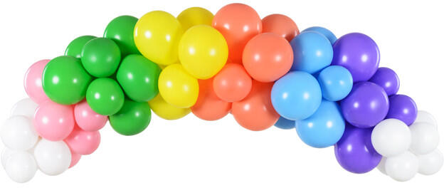Szivárvány léggömbfüzér, a készlet 60 db lufit tartalmaz (14 db pasztell fehér, 8 db pasztell sárga, 7 db pasztell narancssárga, 8 db pasztell rózsaszín, 7 db pasztell lila, 8 db pasztell világoskék és 8 db pasztellzöld színben) ) és kb. 2,5 m-es szalag léggömbfüzérekhez. Kézikönyv mellékelve. (1 db / 60 db. )
