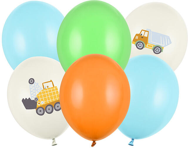 Erős léggömbök Építőipari járművek, a készlet 6 db lufit tartalmaz (2 db pasztell világoskék, 1 db pasztell mand. narancssárga, 1 db pasztell élénkzöld, 2 db pasztell világos krém színben, színes nyomattal), átmérője kb. 30 cm. (1 db / 6 db. )