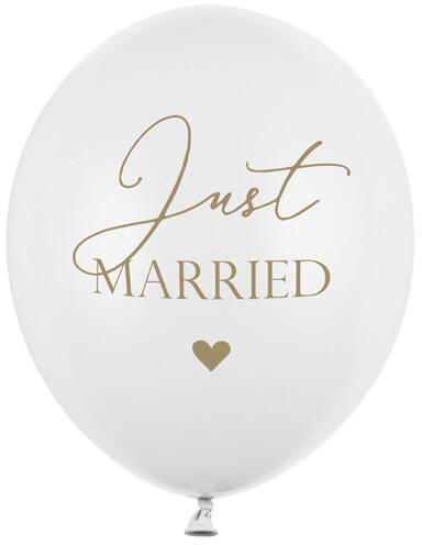 Erős léggömbök, pasztell tiszta fehér, arany kétoldalas nyomattal Just Married, 30 cm átmérőjű. (1 db / 50 db. )