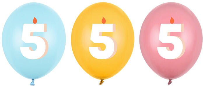 Erős léggömbök ''5'' nyomattal, a készlet 3 színű lufit tartalmaz (Pasztell vadrózsa, pasztell világoskék és pasztell méz) kétoldalas nyomattal, átmérője kb. 30 cm. (1 db / 50 db. )