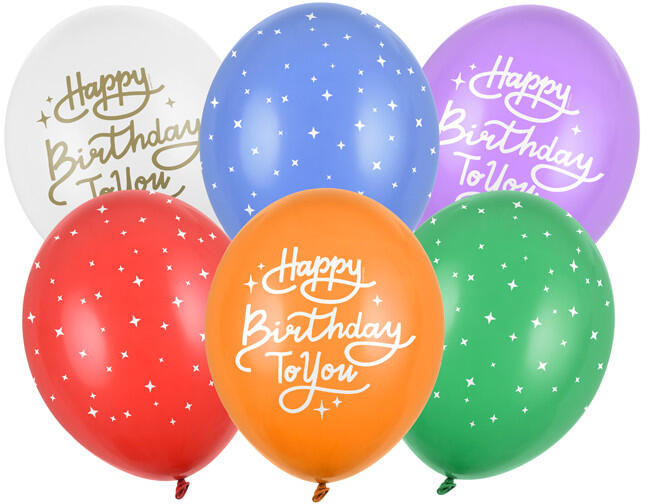 Erős léggömbök Boldog születésnapot nyomattal, a készlet 6 lufit tartalmaz (1 pasztell tiszta fehér színben arany nyomattal, 1 pasztell mandarin narancs színben fehér nyomattal, 1 pasztell Levendula kék színben fehér nyomattal, 1 pasztell mákpiros színben fehér nyomattal, 1 pasztell Ultramarin színben fehér nyomattal és 1 pasztell smaragdzöld színben fehér színnel), átmérő kb. 30 cm. (1 db / 6 db. )