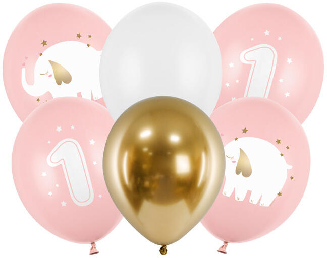 Erős léggömbök Egy év nyomattal, a készlet 6 db lufit tartalmaz (2 db pasztell babarózsaszín színes nyomattal, 2 db pasztell babarózsaszín, fehér nyomattal, 1 db pasztell Pure White és 1 db Glossy gold színű), átmérője kb. 30 cm. (1 db / 6 db. )
