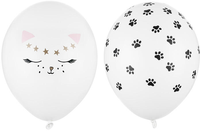 Strong Balloons Cat nyomatokkal, szett 2 mintát tartalmaz: pasztell tiszta fehér színben színes nyomattal és pasztell tiszta fehér színben fekete színnel, átmérője kb. 30 cm. (1 db / 50 db. )