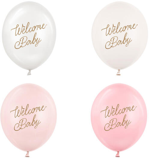 Erős lufi Welcome Baby nyomattal, a készlet 4 színű lufit tartalmaz (Pastel Baby Pink, Pastel Pale Pink, Pastel Off-white és Metallic Pure White) kétoldalas nyomattal, átmérője kb. 30 cm. (1 db / 50 db. )