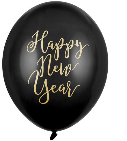 Erős léggömbök, pasztellfekete, arany kétoldalas nyomattal Happy New Year, 30 cm átmérőjű. (1 db / 50 db. )