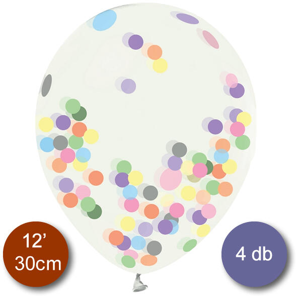 Átlátszó gumi lufi, színes papír konfettivel. 4 db/csomag.