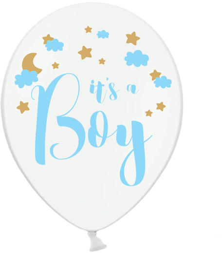 Babaváró latex léggömb, It's a boy felirattal, fehér színben, égkék és arany nyomatokkal, két oldalon nyomott, 5db/cs