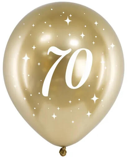 70. Évszámos Latex Lufi - Arany Színben, Fehér Csillagokkal (6 db/cs), 30 cm