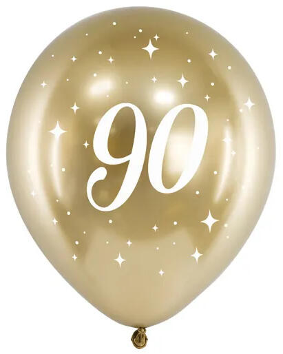 90. Évszámos Latex Lufi - Arany Színben, Fehér Csillagokkal (6 db/cs), 30 cm