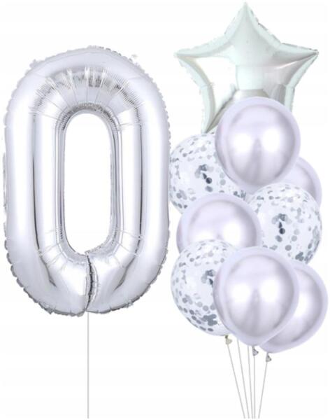 Születésnapi Lufik 10db Ezüst Konfetti 0-ás betű lufi dekorációs szettALLEGRO